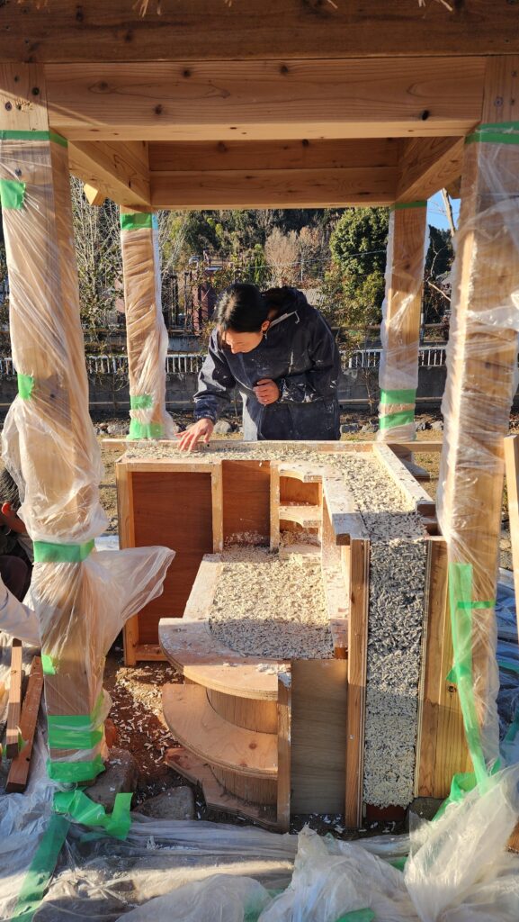 今回は、施工デザイン、型枠作成をIFOO様が行い、ヘンプクリートの打設を弊社が担当するという役割分担で施工を実施いたしました。