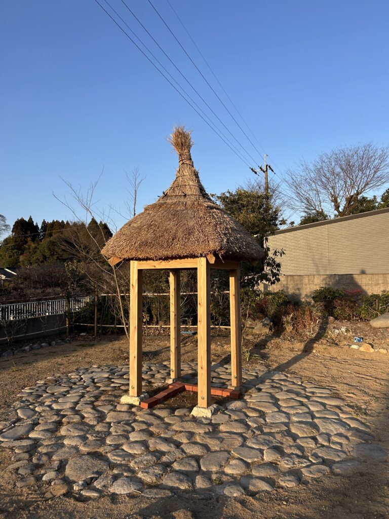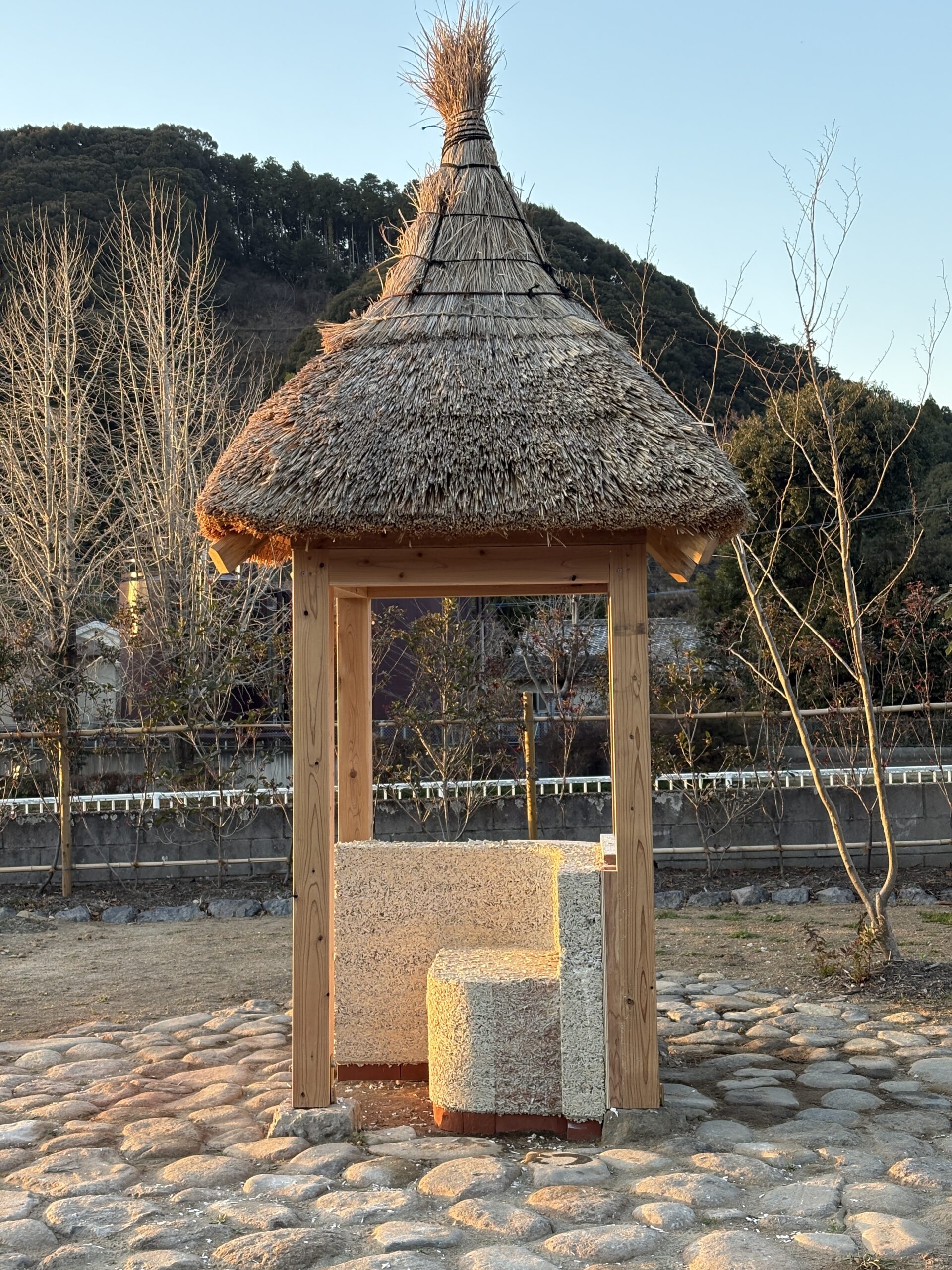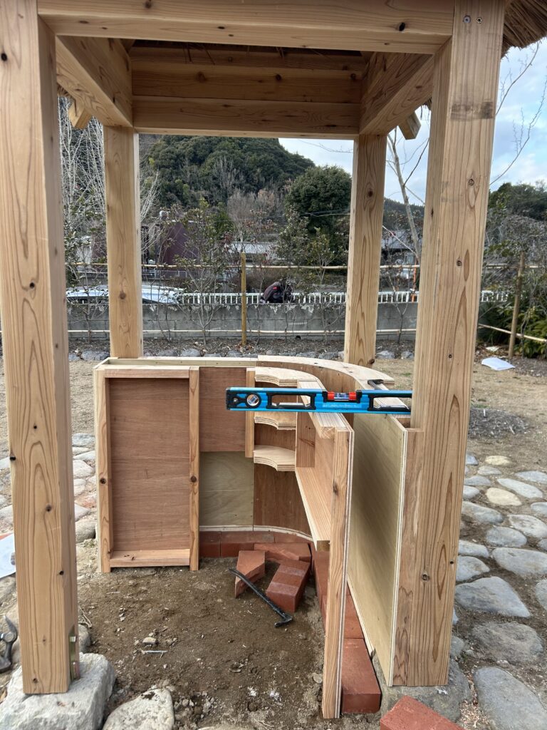 今回は、IFOO様が鹿児島大学の学生とワークショップで設計した、庭に設置した茅葺の東屋の下に、ヘンプクリートの什器を作るという計画で始まりました。
